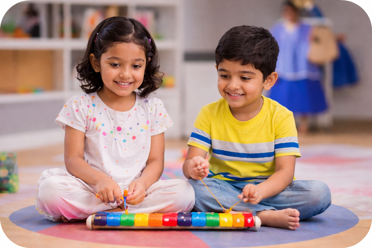 Music sparks joy and boosts brain development. Children explore sounds, rhythm, singing, and simple instruments in a playful environment.
